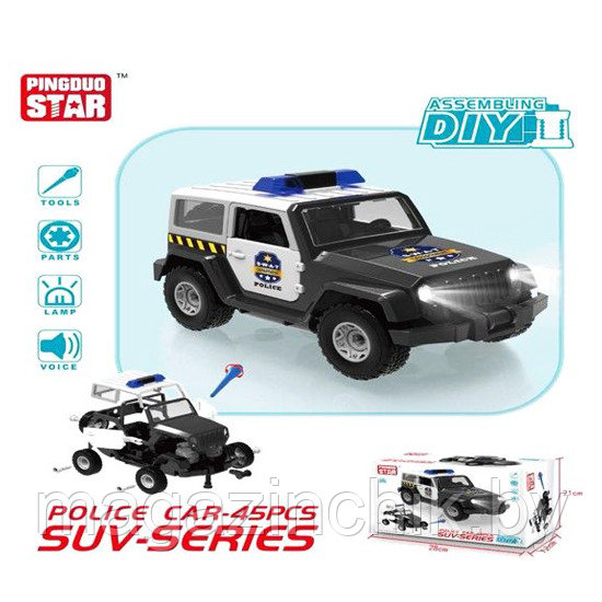 В комплекте подробная инструкция с пошаговым сбором машины. Данная модель - настоящая полицейская машина. Также игрушка работает на батарейках, которые уже входят в комплект. Присутствует звук сирены и свет фар.